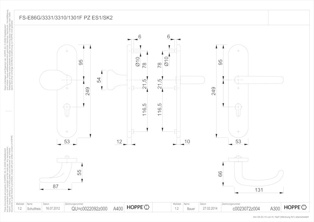 Feuerschutz-Schutz Langschild-WechselgarniturGarnitur / ES1 / F69 Edelstahl matt / 9 mm / FDW-Profilvollstift / Profilzylinder 92 mm / 67-72 mm / HOPPE-Logo