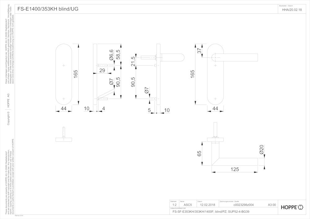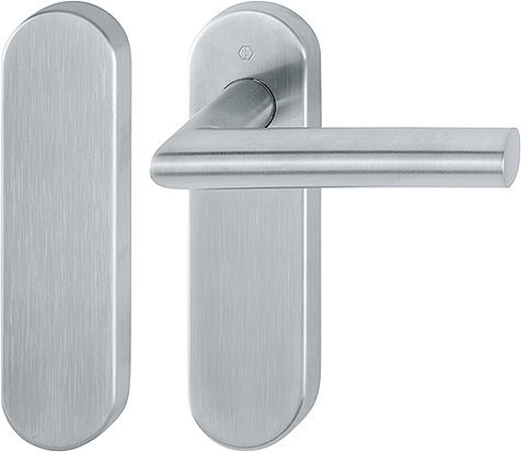 Feuerschutz-Kurzschild-GarniturStandflügelgarnitur / F69 Edelstahl matt / 9 mm / 42 mm vorst. / Vierkantstift mit efha-Einfräsung / A=blind I=ungelocht / 40-65 mm / mit Montagemodul, lose / HOPPE-Logo