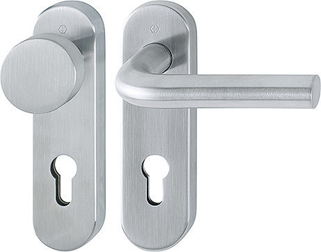 Garnitur / F69 Edelstahl matt / 9 mm / FDW-Profilvollstift / Profilzylinder 72 mm / 40-65 mm / außen=fest, innen=fest/drehbar Kugelarretierung mit Rückholfeder / HOPPE-Logo