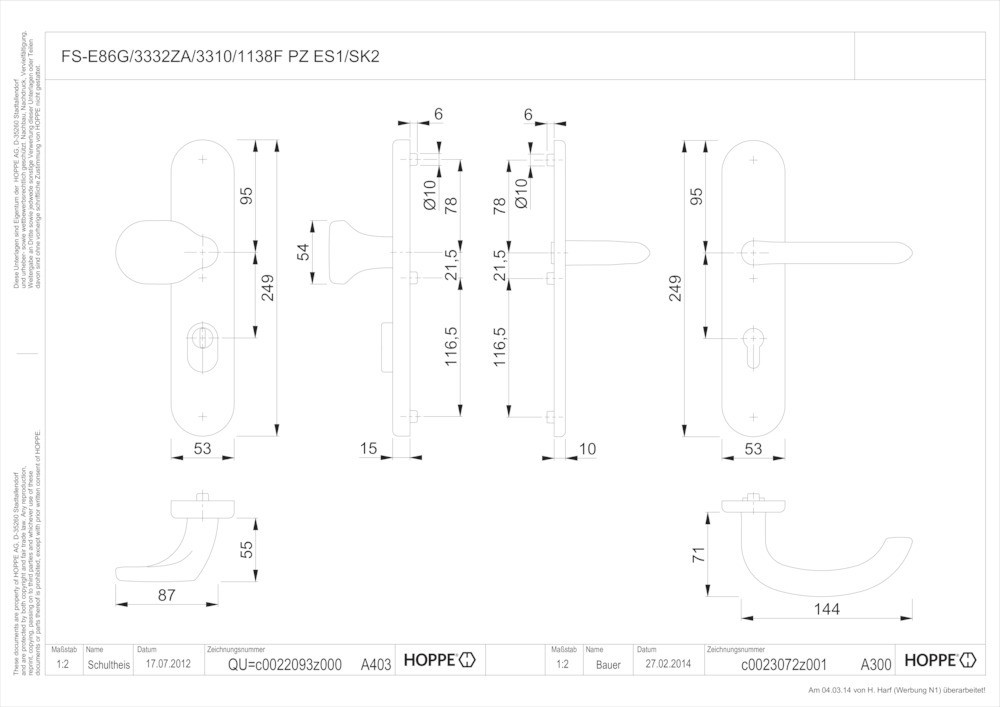 Garnitur / ES1 / F69 Edelstahl matt / 9 mm / FDW-Profilvollstift / Profilzylinder 72 mm / 42-47 mm / HOPPE-Logo