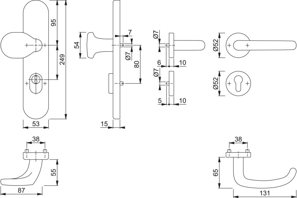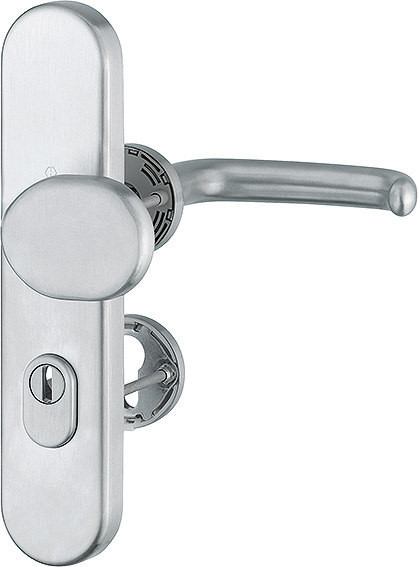 Garnitur / ES1 / F69 Edelstahl matt / 9 mm / FDW-Profilvollstift / Profilzylinder 72 mm / 42-47 mm / außen=fest, innen=fest/drehbar Kugelarretierung mit Rückholfeder / HOPPE-Logo