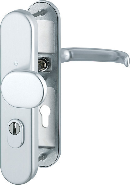 Garnitur / ES1 / F1 Aluminium silberfarben / 9 mm / FDW-Profilvollstift / Profilzylinder 72 mm / 42-47 mm / HOPPE-Logo