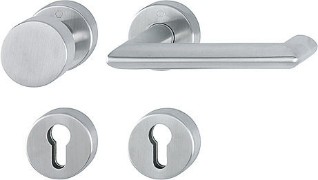Garnitur / F69 Edelstahl matt / 9 mm / FDW-Profilvollstift / Profilzylinder / 40-65 mm / außen=fest, innen=fest/drehbar Kugelarretierung mit Rückholfeder / HOPPE-Logo