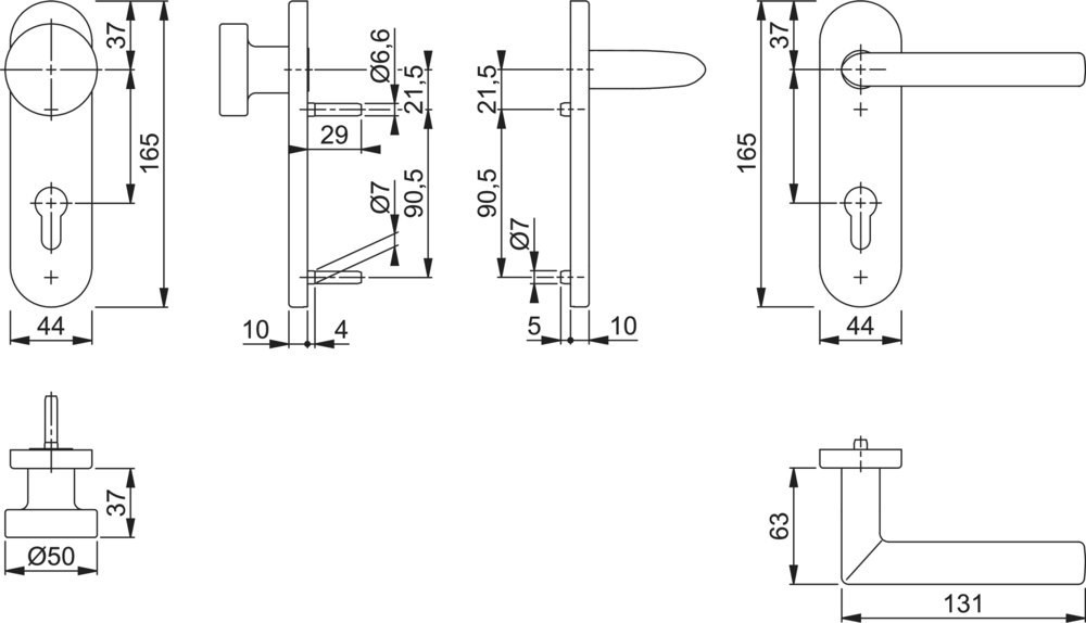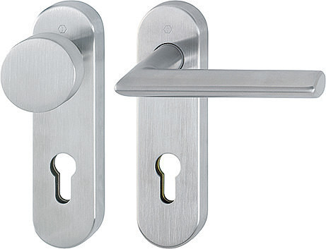 Garnitur / F69 Edelstahl matt / 9 mm / FDW-Profilvollstift / Profilzylinder 72 mm / 40-65 mm / außen=fest, innen=fest/drehbar Kugelarretierung mit Rückholfeder / HOPPE-Logo
