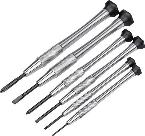 mit gerilltem Stahlgriff · vernickelt · abnehmbare Klingen · induktiv gehärtet · Griffende mit drehbarem Sechskantkopf zum feinfühligen Arbeiten Inhalt: je 1 Schraubendreher für Schlitzschrauben Klingenbreite-Ø 1 / 1,5 / 2 / 3 mm je 1 Schraubendreher für Schrauben mit Kreuzschlitz (PH) Gr. 00 / 0 Weitere technische Eigenschaften: · Verpackung: im Holzkasten