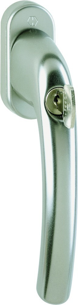 Dreh-/Kipp-Fenstergriff abschließbarF9 Aluminium stahlfarben / N10A, mit Arretierung, stahlgrau / 7 mm / 37 mm vorst. / Druckzyl. 2W153 / 90° / HOPPE-Logo / M5x45 mm mit kurzem Zapfen