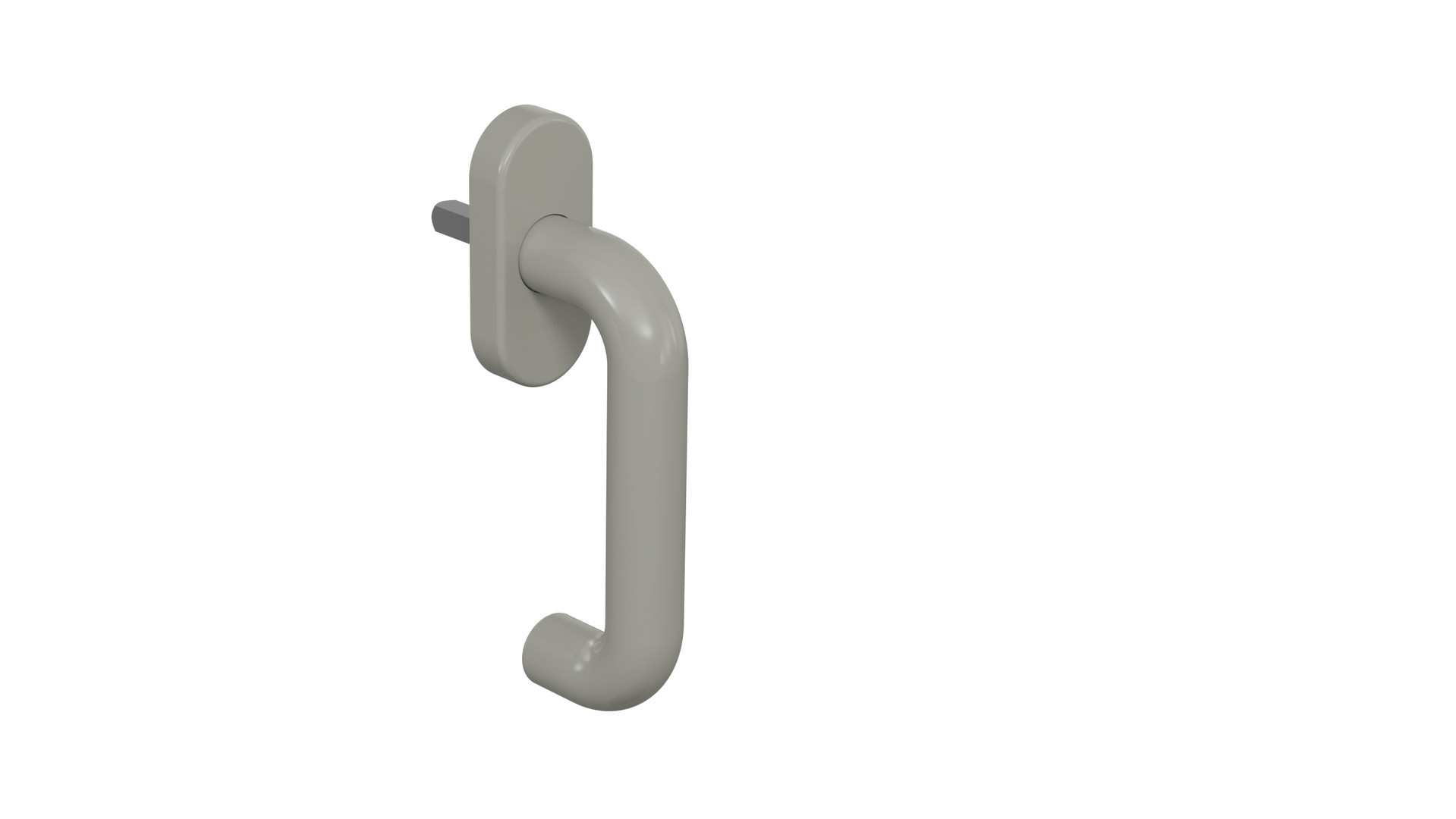 Fenstergriff aus Polyamid mit Stahlkern auf ovaler Rosette, Durchmesser 20 mm. Mit 90° Rastpunkten und 7 mm Vierkantstift 35 mm vorstehend.
