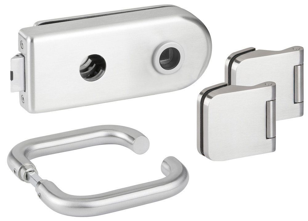 Glastür-Schlosskasten 6018 RZ - Venezia Rundzylinder-Lochung Ø=22 mm inkl. Bandpaar 6315.P und Drückerpaar 1801-60 Oberfl. 60 (Edelstahl matt)