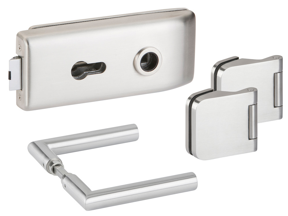 Glastür-Schlosskasten 6023 PZ - Siena PZ gelocht inkl. Bandpaar 6315-20 und Drückerpaar 1802-60 Oberfl. 20 (Edelstahlfarben)