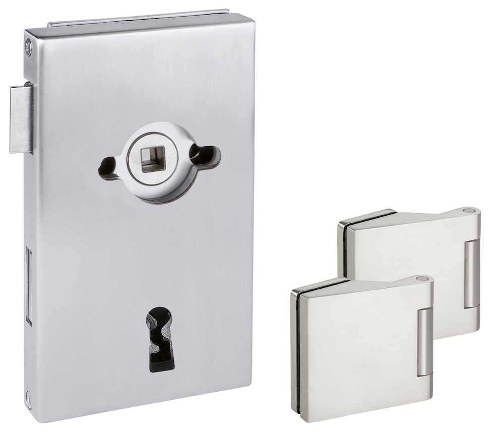Glastür-Schlosskasten 6052-R BB - Molina Buntbart gelocht (inkl. 1 Schlüssel) - DIN rechts inkl. Bandpaar 6325-20 Oberfl. 20 (Edelstahlfarben)
