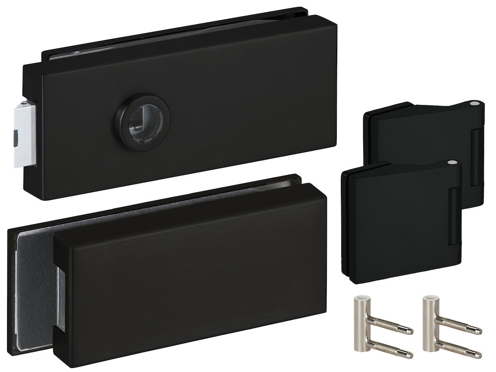 Glastür-Schlosskasten 6071 OL - Treviso ohne Lochung, mit Gegenkasten 6074 GKP inkl. Bandpaar 6325 & Rahment. Holzzarge und Feststeller 6009.C/6610.F + Schnäpper 6702 Oberfl. 74 (Classic Black, ähnl. RAL 9005)
