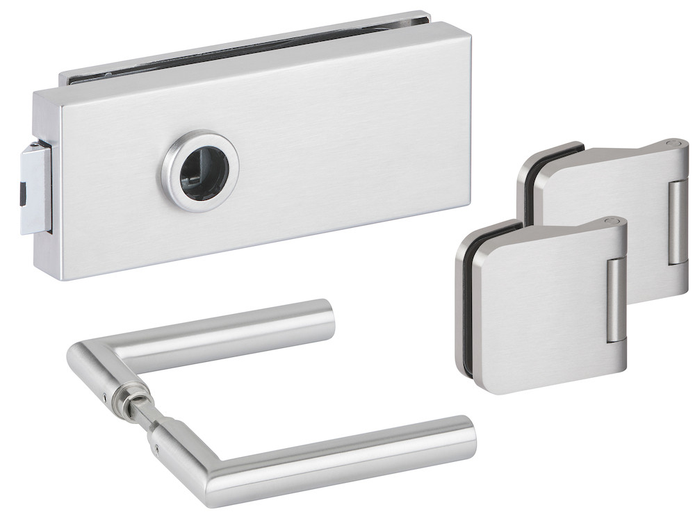 Glastür-Schlosskasten 6071 OL - Treviso ohne Lochung inkl. Bandpaar 6315-20 und Drückerpaar 1802-60 Oberfl. 20 (Edelstahlfarben)