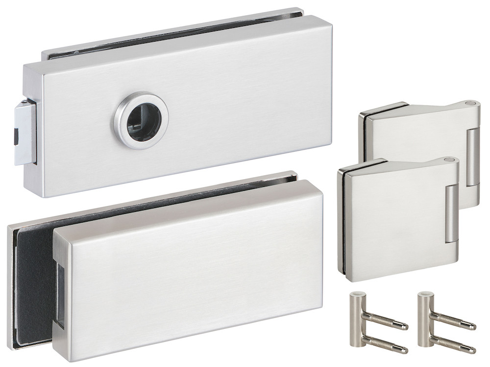Glastür-Schlosskasten 6071 OL - Treviso ohne Lochung, mit Gegenkasten 6074 GKP inkl. Bandpaar 6325-20 & Rahment. Holzzarge und Feststeller 6009/6610.F + Schnäpper 6702 Oberfl. 20 (Edelstahlfarben)