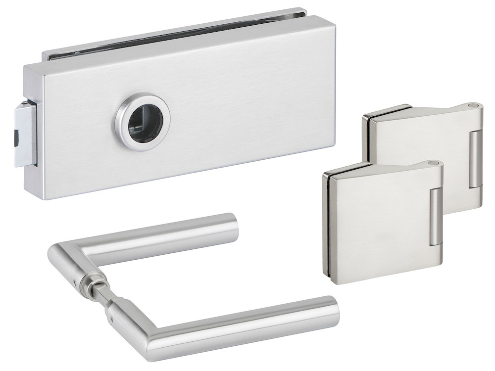 Glastür-Schlosskasten 6071 OL - Treviso ohne Lochung inkl. Bandpaar 6325 und Drückerpaar 1802-60 Oberfl. 60 (Edelstahl matt)