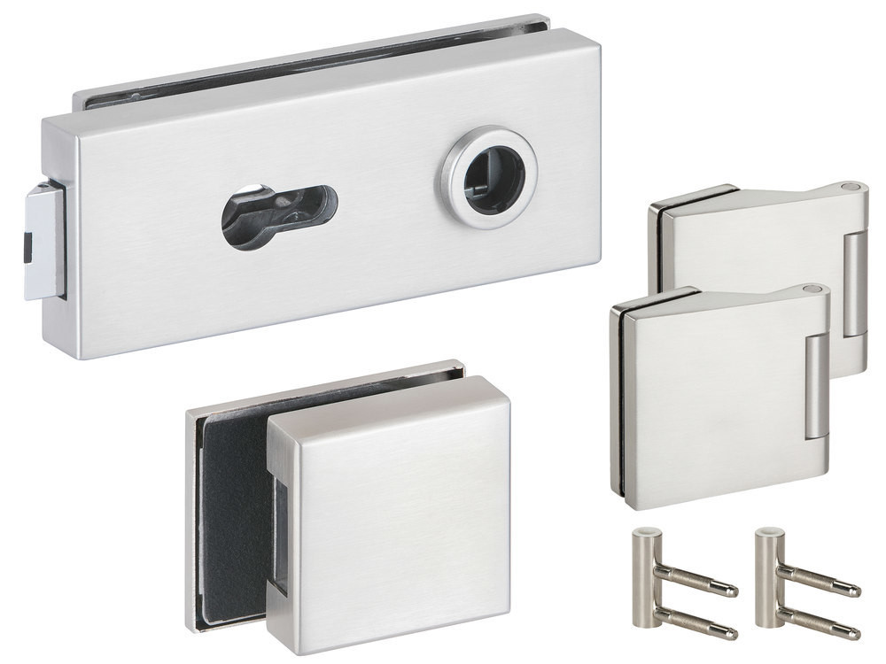 Glastür-Schlosskasten 6073 PZ - Treviso & Gegenkasten 6074 GKS inkl. Bandpaar 6325-20 & Rahment. Holzzarge und Feststeller 6009.C/6610.F + Schnäpper 6702 Oberfl. 20 (Edelstahlfarben)