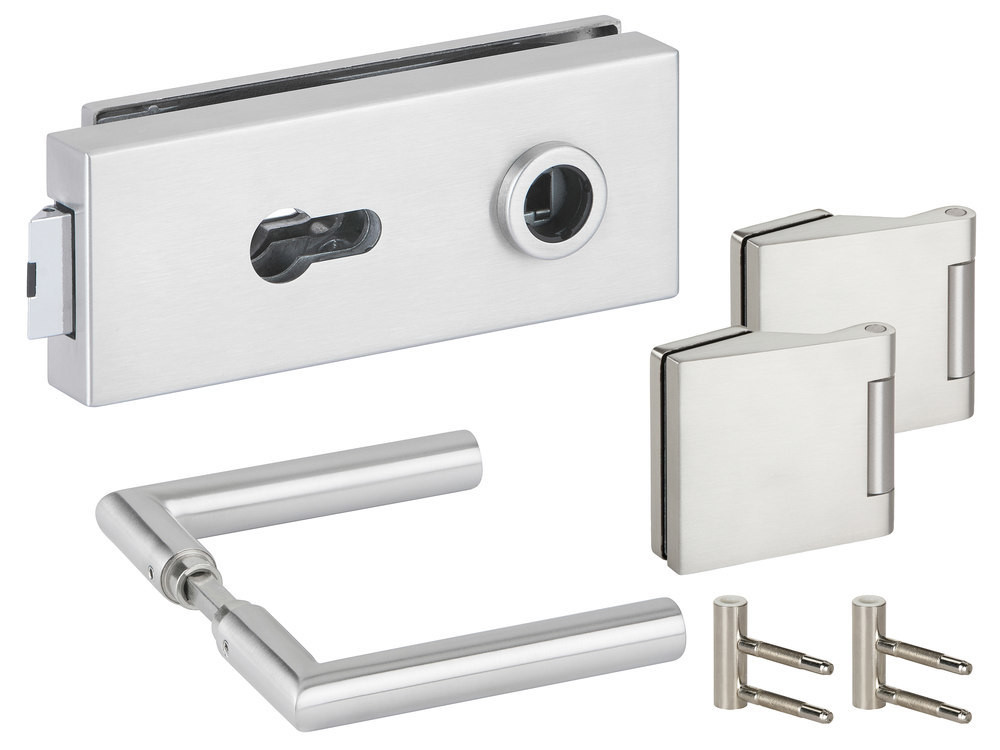 Glastür-Schlosskasten 6073 PZ - Treviso PZ gelocht inkl. Bandpaar 6325-60 & Rahment. Holzzarge Drückerpaar 1802-60 Oberfl. 60 (Edelstahl matt)