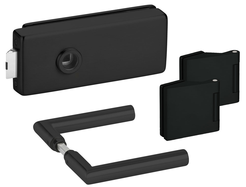 Glastür-Schlosskasten 6081 OL - Genova ohne Lochung inkl. Bandpaar 6325 und Drückerpaar 1802 Oberfl. 74 (Classic Black, ähnl. RAL 9005)