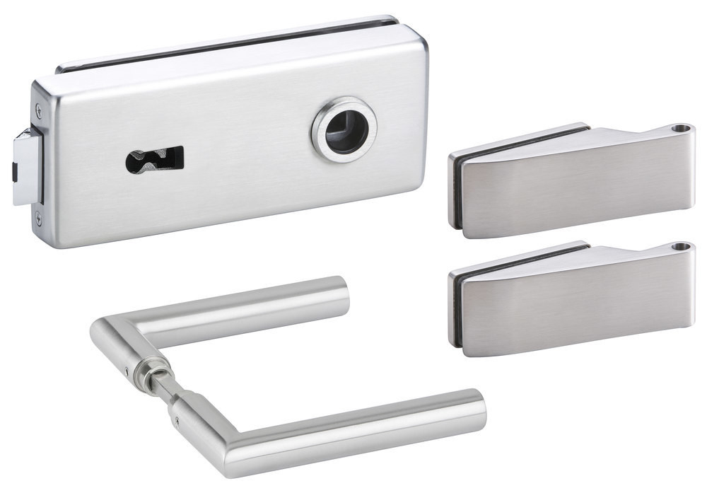 Glastür-Schlosskasten 6082 BB - Genova Buntbart gelocht (inkl. 1 Schlüssel) inkl. Bandpaar 6225-20 und Drückerpaar 1802-60 Oberfl. 20 (Edelstahlfarben)