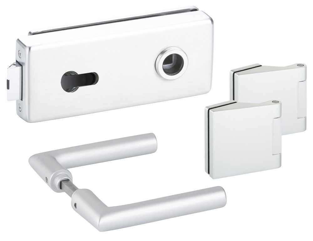 Glastür-Schlosskasten 6083 PZ - Genova PZ gelocht inkl. Bandpaar 6325 und Drückerpaar 1902.AL-F1 Oberfl. F1 (silberfarben eloxiert)