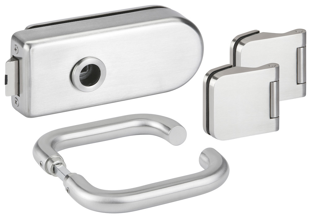 Glastür-Schlosskasten 6761 L OL - BASIC Round ohne Lochung inkl. Bandpaar 6315.P und Drückerpaar 1801-60 Oberfl. 60 (Edelstahl matt)