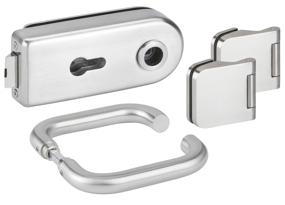 Glastür-Schlosskasten 6763 L PZ - BASIC Round PZ gelocht inkl. Bandpaar 6315.P und Drückerpaar 1801-60 Oberfl. 60 (Edelstahl matt)