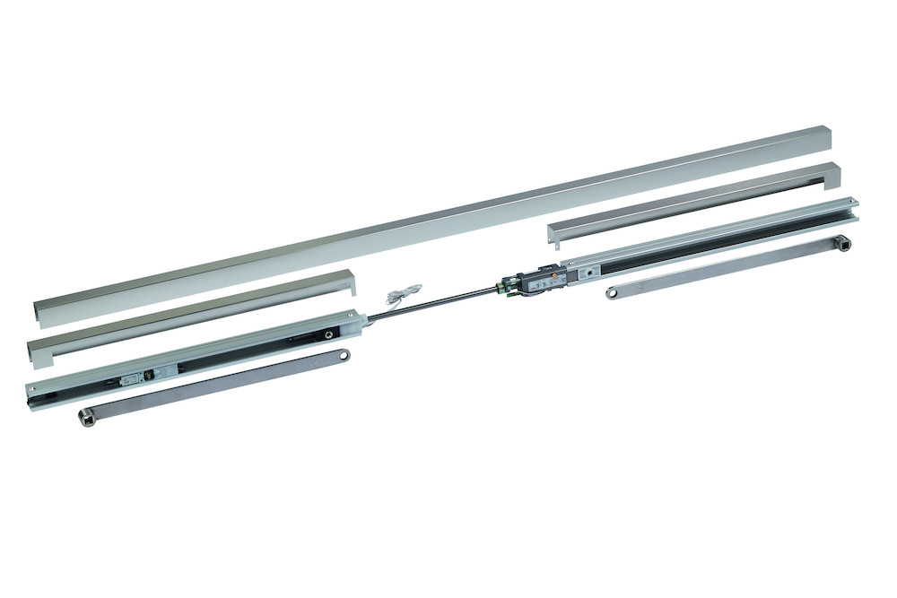 Der Gleitschienenschließfolgeregler GSR-EMF 1 mit elektromechanischer Feststellung im Standflügel im Contur Design für 2-flügelige Türen stellt das Schließen der Türen in der richtigen Reihenfolge sicher: erst Stand- , dann Gangflügel. Das von der Hydraulik der Türschließer unabhängige Schubstangen-Klemmsystem arbeitet mit einer Überlastsicherung. Der Auslösemechanismus ist in die Gleitschiene integriert.