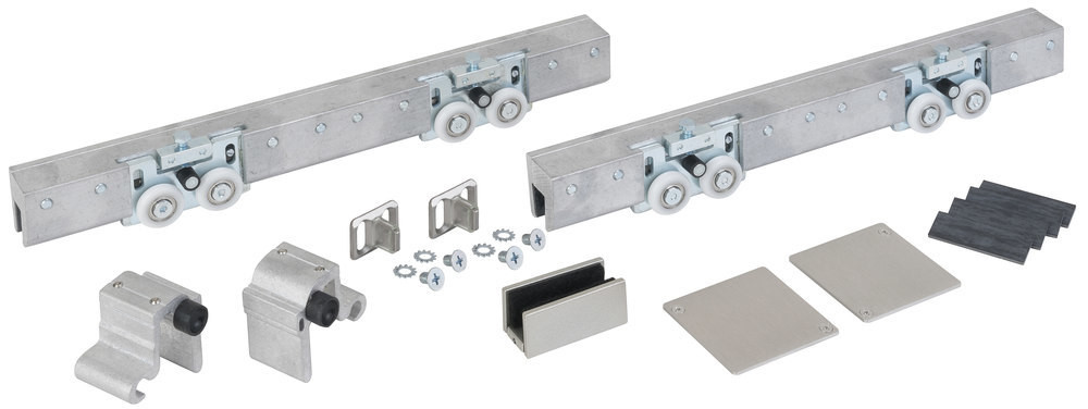 Grundkarton 9170 San Remo ohne Laufprofil und Dämpfer / 2 Stopper 2 Laufwagen 150 kg mit Safe Close Fanghaken 1 Bodenführung für Glas / 1 Paar Alu Endkappen Oberfl. F9 (Edelstahlfarben)