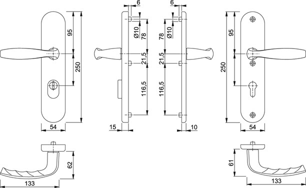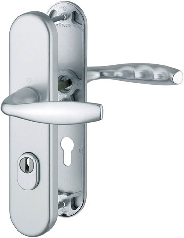 Hoppe Schutzbeschlag der Schutzklasse ES1 (SK2). Stahl-Unterkonstruktion im Außenschild und Zamak-Unterkonstruktion im Innenschild mit Zylinderabdeckung. Hochfeste Verschraubung von innen sichtbar. Montagefreundliche Schnellstift-Verbindung. Mit Rückholfe