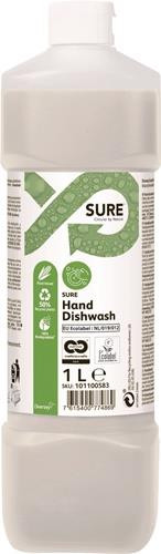konzentriert · zur Reinigung von Töpfen, Pfannen, Geschirr, Glas und allen abwaschbaren Utensilien · reduzierte Schaumbildung · schnelles Lösen von Fett und angetrockneten Speiseresten · glänzende Oberflächen durch streifenfreies, einfaches Abspülen · duft- und farbstofffrei · zertifiziert nach EU-Ecolabel · Mischverhältnis: 0,1% bis 0,2% (5 ml - 10 ml Reiniger auf 5 Liter Wasser) SURE-Reinigungsmittel sind auf pflanzlicher Basis, zu 100% biologisch abbaubar sowie sicher in der Anwendung - keine umweltgefährdende Einstufung, keine Kennzeichnung, keine Gefährdung für Anwender Weitere technische Eigenschaften: · Gebinde: Flasche · Inhalt: 1l