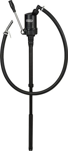 einfachste Fassmontage mittels Fassadapter und Stecksystem - im 30° Raster in 12 Positionen frei positionierbar · Pumpengehäuse mit Kolben, Handhebel und Kunststoffauslaufkrümmer · für stehende 60/200/220 l Fässer · Teleskopsaugrohr L. 355-955 mm · 2 Gewinde: M64 x 4 mm und G2″ · Abgabeschlauch, 1500 mm, mit Stahlauslaufkrümmer · Schlauchhalter · für Öle bis SAE 50, Diesel, Petroleum, Kerosin, Glyzerin und Kühlerfrostschutz unverdünnt