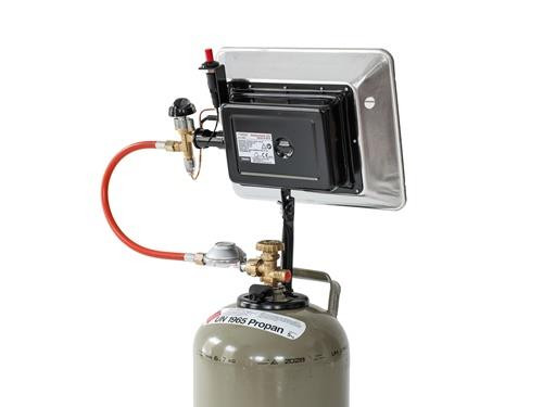 Gas-Aufsatz-Heizstrahler für 5 kg und 11 kg Propangasflaschen · Zündsicherung · robustes Metallgehäuse mit Schutzgitter · stufenlos regelbar · mit Thermosicherung Weitere technische Eigenschaften: · Gewicht: 2,5kg