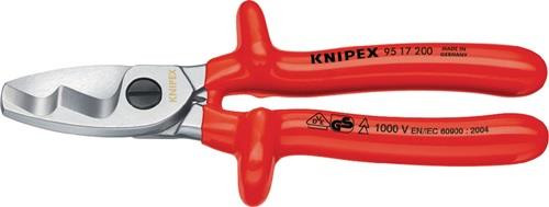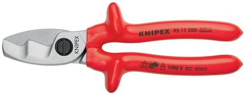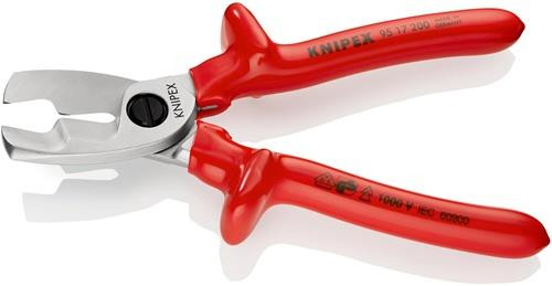 VDE-isoliert bis 1000 V · gefertigt gem. DIN EN/IEC 60900, stückgeprüft · mit Doppelschneide · für Kupfer-/Alukabel, ein- und mehrdrähtig · gehärtete Schneiden mit Präzisionsschliff · mit Vor- und Nachschnitt (1. und 2. Schneide) können Kabel bis 20 mm Ø in Einhandbetätigung getrennt werden · nicht für Stahldraht und hartgezogene Kupferleiter geeignet · Klemmschutz · Spezial-Werkzeugstahl in Sondergüte, geschmiedet, ölgehärtet Werkzeug verchromt Weitere technische Eigenschaften: · Kopf: verchromt · Kennzeichnung: VDE · Gewicht: 360g