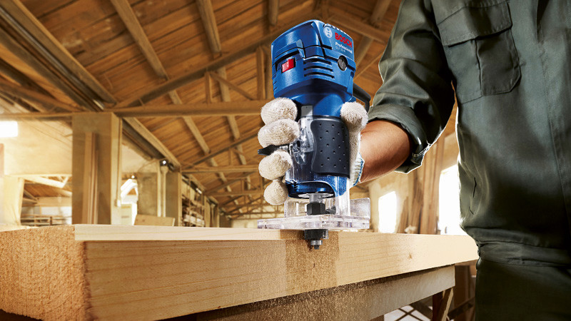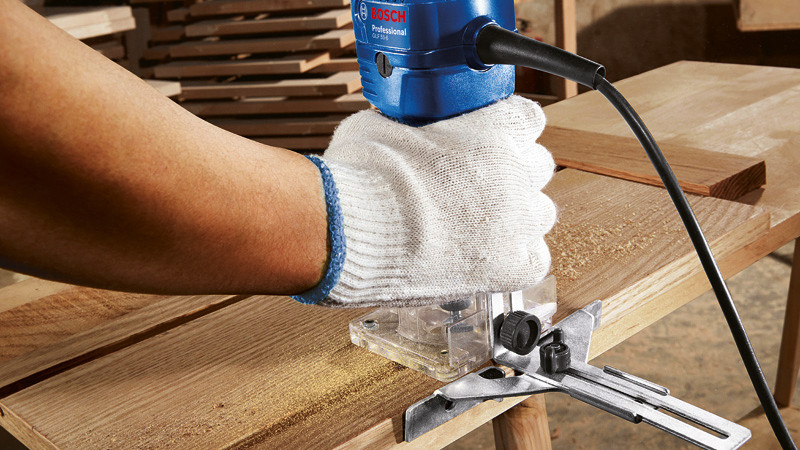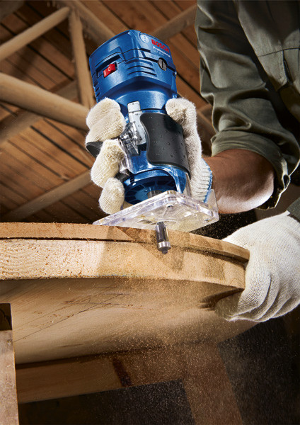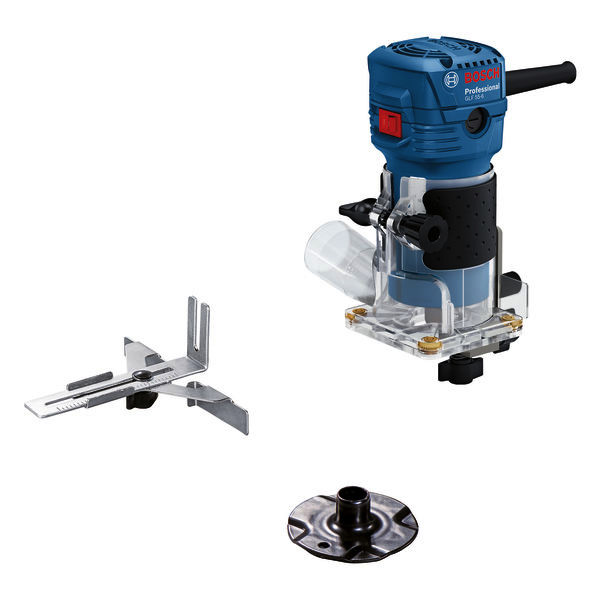 Kantenfräse GLF 55-6, Die GLF 55-6 verfügt über einen 550-W-Motor mit einer Drehzahl von 33.000 min⁻¹ für schnelle und saubere Fräsergebnisse, und ein Zahnstangensystem zur Tiefeneinstellung erlaubt leichtes Ändern der Spandicke. Diese professionelle Laminatfräse verfügt über ein ultrakompaktes Design und einen schmalen Griffbereich für eine mühelose Einhandkontrolle des Werkzeugs. Die enthaltene Führungsrolle zum Bündigfräsen erlaubt eine Durchführung von Bündigschnitten mit einem Standard-Geradfräser und schützt vor dem Risiko, bei Kontakt empfindliche Furniere zu beschädigen, was häufig bei der Verwendung von traditionellen kugellagergeführten Fräsen zum Laminatschneiden vorkommt. Der mitgelieferte Parallelanschlag bietet zusätzliche Vielseitigkeit zum Fräsen von Lichtrinnen, und der transparente Fuß aus Polycarbonat ermöglicht für maximale Sicht noch mehr Licht im Schnittbereich während er gleichzeitig für eine geringere Größe und ein geringeres Gewicht des Werkzeugs sorgt. Kopiereinheit (1 619 PB2 369). Parallelanschlag (2 608 000 331). Rollenführung zum Bündigfräsen (2 608 000 332). Absaugadapter (2 608 000 804). Spannzange 6 mm (1 619 PB3 058). Kopierhülse (2 609 110 223). Einmaulschlüssel 10 mm (2 609 110 254). Einmaulschlüssel 17 mm (1 619 PB2 377)