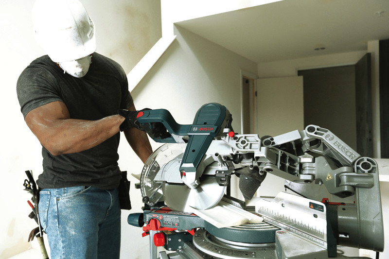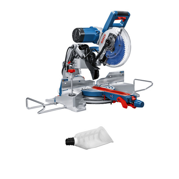 Kapp- und Gehrungssäge GCM 10 GDJ, Die Kapp- und Gehrungssäge GCM 10 GDJ Professional vereint Leistung auf dem neuesten Stand der Technik mit einem revolutionärem Design. Das Axial-Glide™-System von Bosch gewährleistet dauerhafte Präzision und sanftes Gleiten, sogar bei der Arbeit auf beengtem Raum. Sicher und komfortabel: Neigungseinstellung an der Vorderseite gewährleistet schnelles und einfaches Einstellen ohne das Risiko, hinter die Säge greifen zu müssen. Der Kopf kann in der Kappschnittposition fixiert werden für maximale Kappschnittkapazität. Diese Säge eignet sich ideal für die Verwendung bei hartem und weichem Holz, Holzverbundstoffen, MDF-Platten sowie Konstruktionsholz und ist die perfekte Wahl für alle Zuschnittarbeiten in Bereichen wie Zimmerei, Umbau, Fenstereinbau und Schrankbau. Die Säge ist mit den folgenden Arbeitstischen kompatibel: GTA 2500 Compact, GTA 2500 W, GTA 2600 und GTA 380 Die GCM 10 GDJ Professional bietet außerdem eine große, gut ablesbare Neigungs-/Gehrungsskala sowie große Anschläge und gefräste Winkel für eine optimale Materialstütze. 1 x Kreissägeblatt, Expert for Wood, 254 x 30 x 2,4 mm, 60 (2 608 642 530). Klemme (1 609 B06 203). Staubsack (ET-Nr. 1 609 B00 506)
