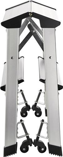 fahrbar · aus stabilem Aluminium, zusammenklappbar · durch die 4 Gleitrollen frei beweglich (360°) · Klapptritt senkt sich bei Belastung unverrückbar und bietet sicheren Stand · alle Kanten durch Kunststoffkappen geschützt · max. Gesamtbelastung 150 kg Weitere technische Eigenschaften: · Höhe geklappt: 500mm · Breite geklappt: 420mm · Tiefe geklappt: 200mm · prüfpflichtig: ja