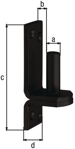 auf Platte DI-Haken · Material: Stahl roh · Oberfläche: verzinkt, schwarz kunststoffbeschichtet Weitere technische Eigenschaften: · Maß a: 16mm · Maß b: 13mm · Maß c: 115mm · Maß d: 40mm