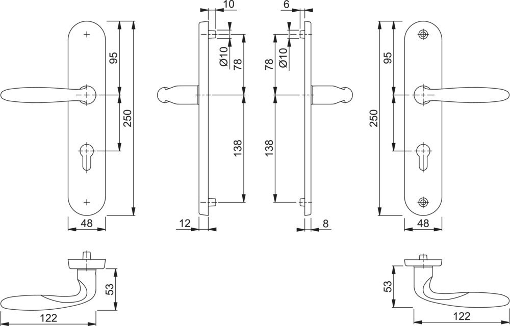 • Außen: gehärteter Stahlanbohrschutz im Zylinderbereich, gekröpfter, feststehender Knopf (ummontierbar)