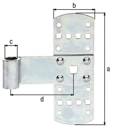 Material: Stahl roh, Oberfläche: galvanisch verzinkt, dickschichtpassiviert Weitere technische Eigenschaften: · Maß a: 140mm · Maß b: 50mm · Maß c Ø: 13mm · Loch-Ø: 5 / 5,5 x 5,5 / 9 x 9mm · Maß d: 75mm