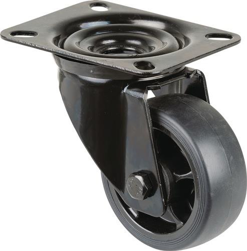 Transportrolle · Gehäuse aus Stahlblech, schwarz · Rollenlager · thermoplastisches Gummirad schwarz · zweireihiger Kugelkranz im Gabelkopf · Radkörper Kunststoff schwarz · mit Plattenbefestigung Weitere technische Eigenschaften: · Ausführung: Lenkrollen · Schraubloch-Ø: 9mm · Schraublochentfernung: 84x64/76x56mm · Befestigungsart: mit Anschraubplatte