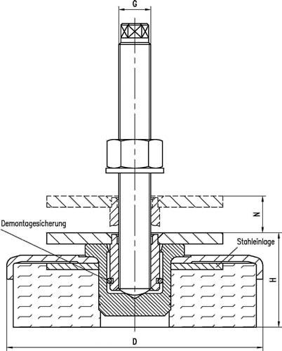 verzinkte Ausführung · geeignet für Drehmaschinen, Fräsmaschinen, Sägen und weitere Maschinen · Sie geben Maschinen einen sicheren Stand und isolieren Schwingungen in zweifacher Hinsicht. Sie isolieren die durch die maschinenerzeugten Schwingungen gegenüber der Umgebung und sie isolieren Präzisionsmaschinen gegen Schwingungen, die von außen verursacht werden. · So wählen Sie den richtigen Maschinenschuh: Stellen Sie das Gewicht der Maschine fest. Teilen Sie das Gewicht der Maschine durch die Anzahl der Befestigungsbohrungen und stellen Sie dabei die maximale Belastung pro Maschinenschuh fest. In der unten aufgeführten Tabelle finden Sie die entsprechenden Größen der Maschinenschuhe. Weitere technische Eigenschaften: · max. statische Belastung pro Maschinenschuh: 50 - 500kg · Höhe einschl. Nivellierplatte H: 41mm · Gewindebolzen G: M12 x 1,25 x 120mm · Nivellierausgleich N: 18mm · Ø D: 80mm