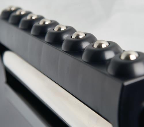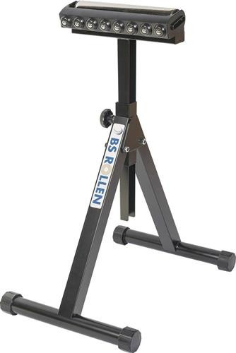 Kombiständer mit abschwenkbarem Rollenträger · Materialzufuhr über die Tragrolle oder den Kugelrollen-Träger möglich · 2-Fuß-Stahlkonstruktion, schwarz lackiert · Tragrolle Stahl verzinkt Ø 60 x 1,5mm · Kugelleiste mit 8 Kugeln · stufenlose Höhenverstellung, zusammenklappbar · Niveauausgleich für unebene Böden · Tragfähigkeit 200 kg · Flächenlast auf der gesamten Auflagenbreite