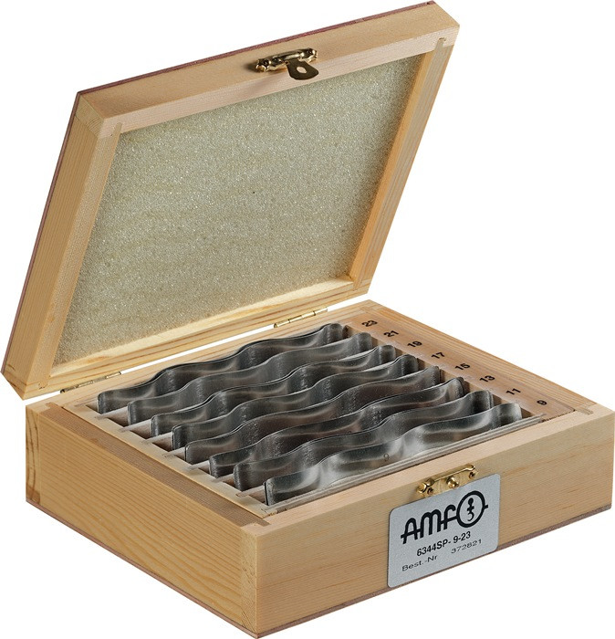 wellenförmig · im Holzkasten · Materialdicke 0,3 mm · präzisionsgeschliffen · Federstahl gehärtet und angelassen · Höhenabstufung 2 mm · Paartoleranz tp in der Höhe IT 5 · Nennmaßtoleranz in der Höhe ±0,004 mm · restliche Maße nach DIN ISO 2768m · Vorteil: · auf der Auflagefläche bleiben keine Späne liegen · Parallelität des gespannten Werkstückes wird nicht beeinträchtigt · mehrere flache oder einzelne dünne Werkstücke können leicht gespannt werden Weitere technische Eigenschaften: · Inhalt: 8 Paar