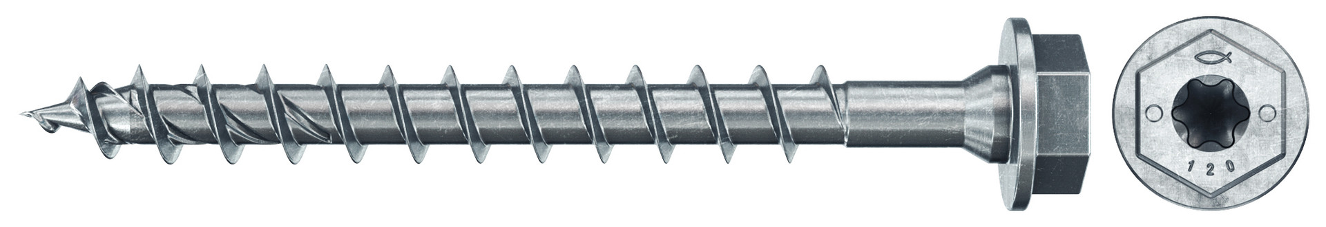 Die fischer Holzbauschraube PowerFast FPF II-HWTF BC ist die kraftvolle Holzbauschraube mit Sechskantkopf und Innenstern-Aufnahme für den konstruktiven Holzbau. Die Holzbauschraube ist die schneller zu verarbeitende Alternative zu Schrauben nach DIN 571. Der Sechskantkopf ermöglicht die Verwendung von Stecknüssen, alternativ garantiert der Innenstern-TX-Antrieb höchste Kraftübertragung bei maximaler Bitstabilität. Das Gewinde ermöglicht das feste Anbinden von Metallelementen an Holz. Die Europäische Technische Bewertung garantiert ein zusätzliches Plus an Sicherheit. Die PowerFast II ist durch die Gewindeform besonders leicht ohne Vorbohren einzuschrauben. Das PowerFast II-Gewinde reicht bis in die Schraubenspitze und sorgt für schnellen Anbiss.