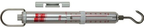 metrisch · genaue handliche Federwaage mit robustem, eloxiertem und abriebfreiem Aluminiumrohr sowie langer Präzisionsskala mit hoher Auflösung · Tara- und Nullstellvorrichtung sowie dreh- und schwenkbarer Aufhängebügel · Haken dreh- und schwenkbar, sowie durch verschiedenes Zubehör austauschbar · Aufhängeelemente aus Inox · Schleppzeiger (z.B. für stehende Anzeige bei Zerreissproben bis maximal 30 kg) und handlicher, abnehmbarer Handgriff im Lieferumfang enthalten · Messmittel zur Gewichtsbestimmung und Zugkraftmessung