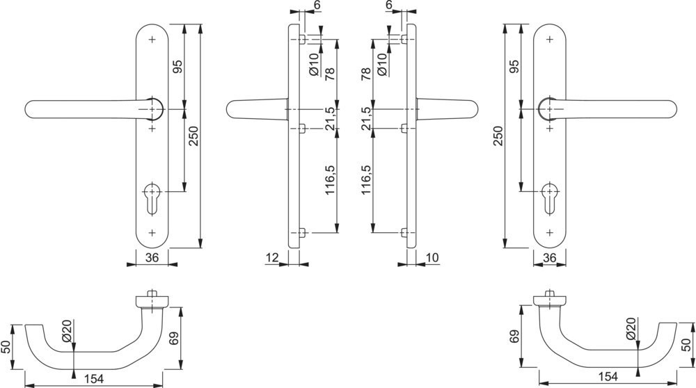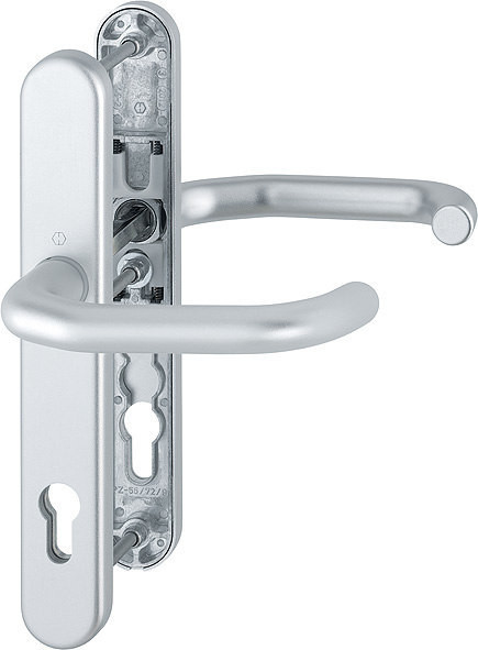 Schutz-Schmalschild-GarniturGarnitur / ES1 / F1-2 Aluminium silberfarben matt / 8 mm / Profilzylinder 92 mm / 67-72 mm / HOPPE-Logo