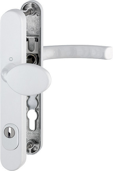 Garnitur / ES1 / F9016 verkehrsweiß / 8 mm / Profilzylinder 92 mm / 67-72 mm / außen=fest, innen=mit Rückholfeder / HOPPE-Logo