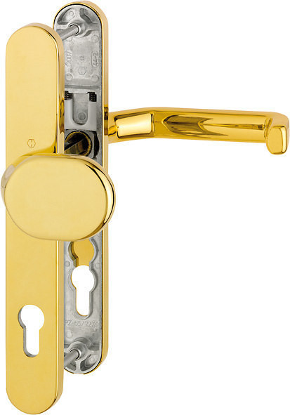 Garnitur / F77-R messingf. poliert - Resista® / 8 mm / Profilzylinder 92 mm / 67-72 mm / HOPPE-Logo