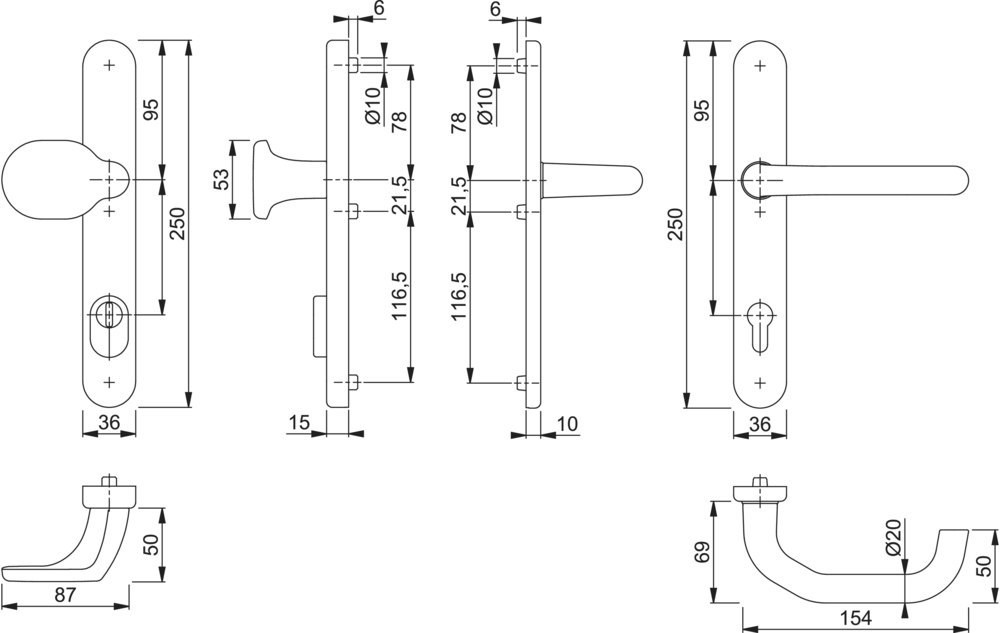 Garnitur / ES1 / F1 Aluminium silberfarben / 9 mm / FDW-Profilvollstift / Profilzylinder 92 mm / 67-72 mm / HOPPE-Logo