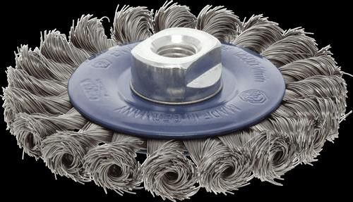 gezopfte Rundbürste in Industriequalität zur universellen Anwendung auf allen gängigen Winkelschleifern · aggressive und schnelle Reinigung · alle Drahtspitzen sind gleichzeitig im Einsatz · hohe Standzeit · TÜV-Süd zertifiziert (Sicherheit geprüft · Produktion überwacht) · zum Aufrauen, Entgraten und einfachen Entrostarbeiten Stahl, Edelstahl · Bohrung 22,2 mm Ø