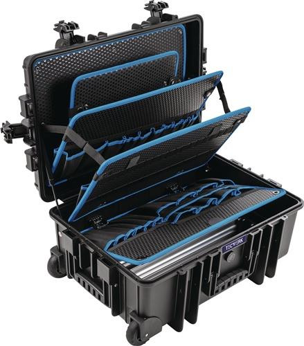 rollbar · Kofferschalen extrem robust aus Polypropylen · absolut stabil staubdicht und spritzwassergeschützt · ergonomischer Zwei-Komponentengriff · automatisches Luftdruckausgleichsventil · Eigentumskennzeichnung möglich · Ösen für Vorhängeschloss (Vorhängeschloss gehört nicht zum Lieferumfang) · 2 große Rollen und komfortabler Teleskopgriff · Bodenschale individuell unterteilbar durch Alu-Trennstege Außenmaße Art.-Nr.: (B x T x H) 602 x 261 x 426 mm · Ausstattung: Werkzeugtafeln mit insgesamt 42 Werkzeugtaschen und 67 elastischen Werkzeughalteschlaufen, Dokumentenfach im Deckel, zwei Gasdruckfedern verhindern das Zuklappen des Deckels Weitere technische Eigenschaften: · Außenhöhe: 426mm · Außenbreite: 602mm · Außentiefe: 261mm